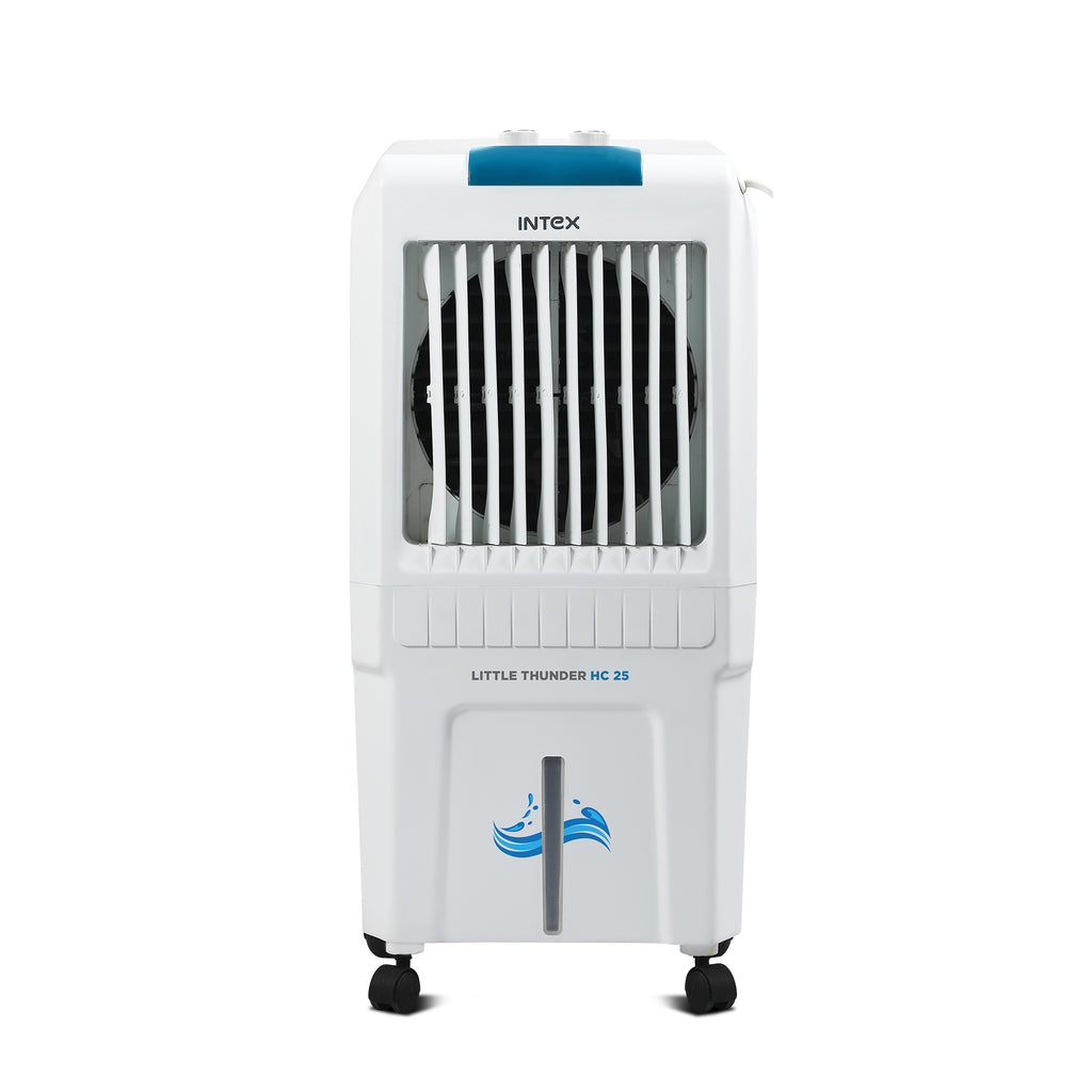 The Intex Little Thunder HC 25 is a sleek and space-saving air cooler built for effective personal and room cooling. Equipped with a 25-litre water tank and efficient fan blades, it provides strong airflow while remaining energy efficient. Its compact vertical design, rust-proof body, and honeycomb pads make it a practical choice for modern homes.