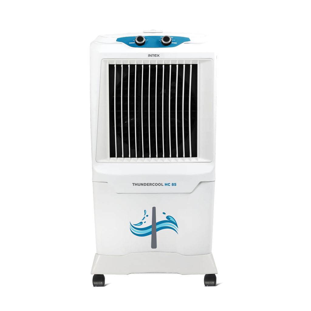 The Intex ThunderCool HC 85 Desert Air Cooler is built for powerful cooling in medium to large rooms. Featuring a large 85-litre water tank, it provides longer cooling duration with fewer refills. The cooler is equipped with 4-way air deflection for uniform air circulation and a high-performance motor that delivers strong air throw even during peak summer heat. The 3-side honeycomb cooling pads improve water retention and enhance cooling efficiency. Designed for convenience and durability, the HC 85 is inverter compatible, has a shock and rust-proof body, and comes with 360° moving wheels for effortless movement. It is an ideal solution for those seeking high-capacity, long-lasting summer cooling.