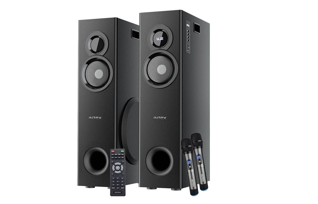 Intex TW11803 Tower Speaker allows you to play music via Bluetooth, AUX Cable, USB Memory of 32 GB, and even FM Radio.